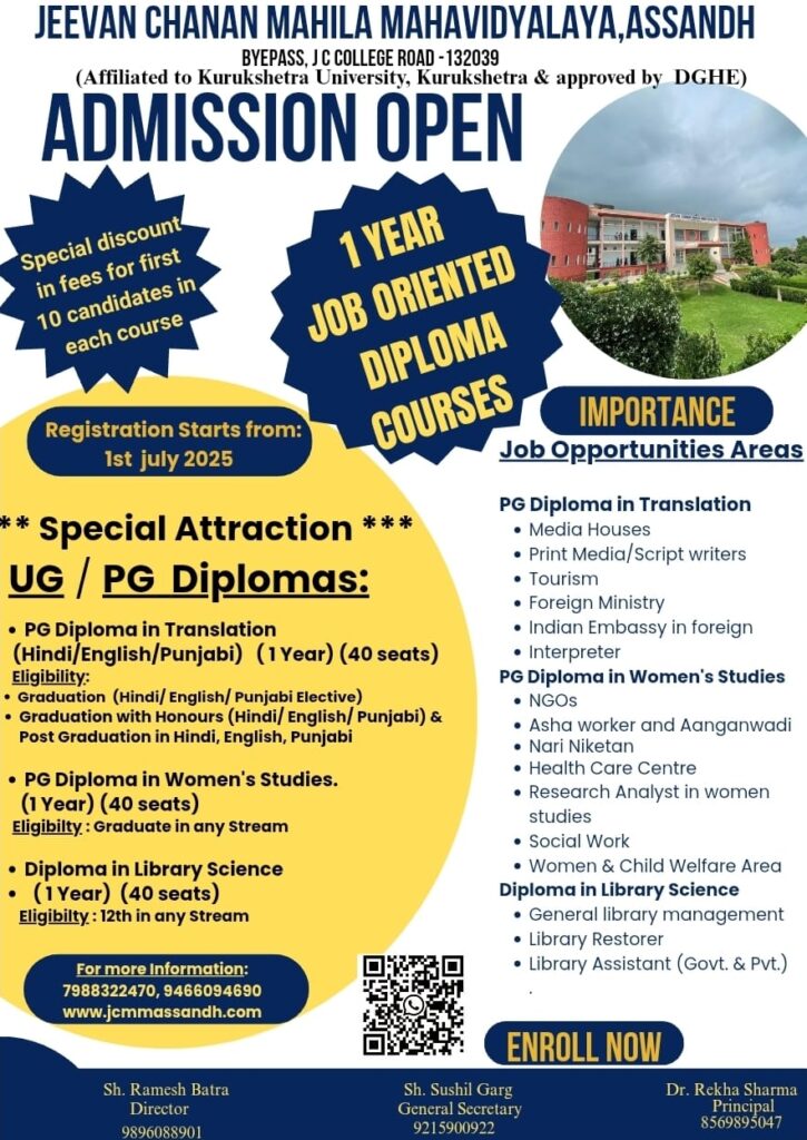 Jeevan Chanan Mahila Mahavidyalaya Assandh was established by Sh. Baldev Raj Arora, a philanthropist, in the memory of his mother Smt. Jeevan Devi Ji and his father Sh. Chanan Das ji in the year 2003. The main purpose of the establishment of this college was to promote women education in this rural area where there was no college exclusively for women at that time.